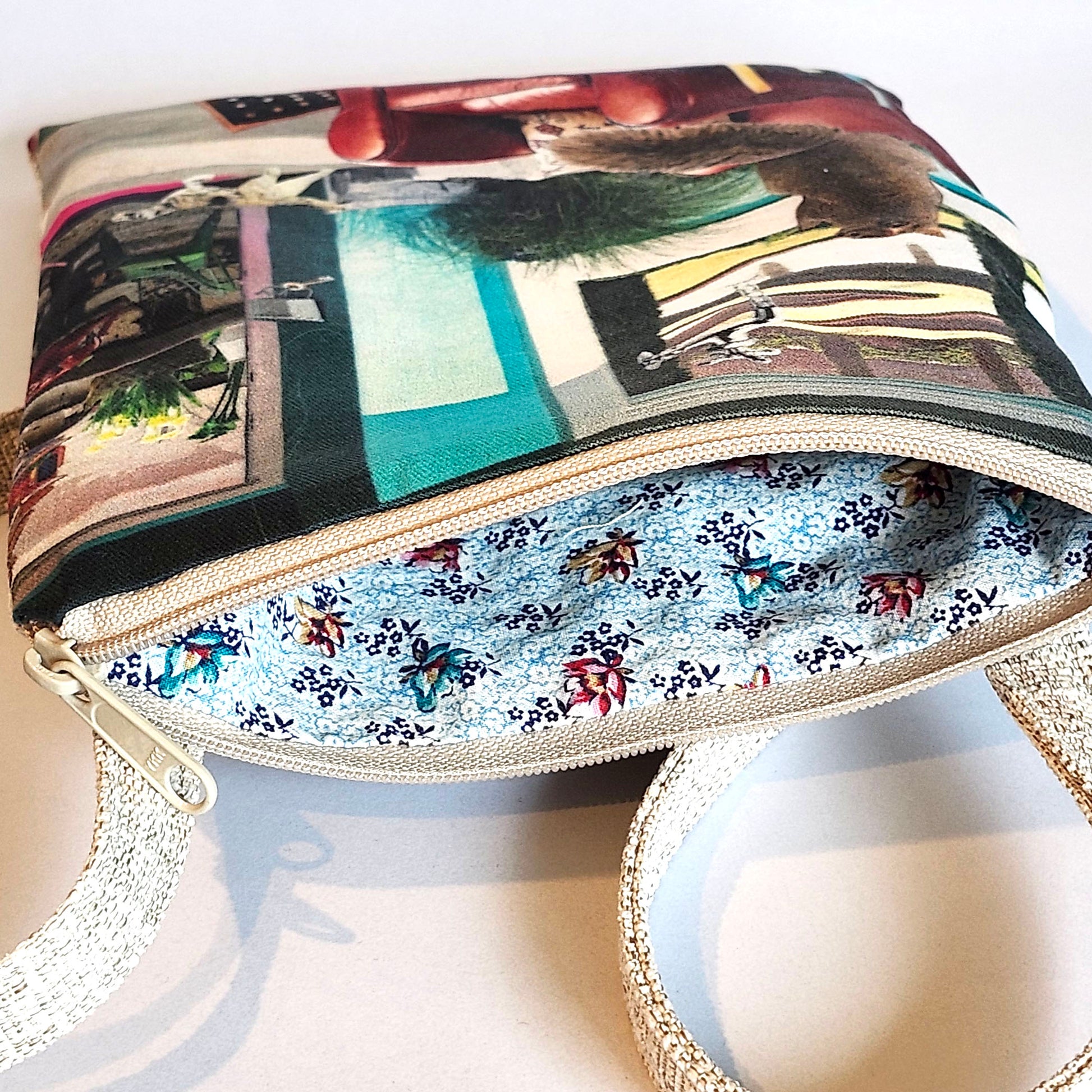 - Original collage printed on cotton, cotton lining, upholstery tweed, YKK and recycled zippers